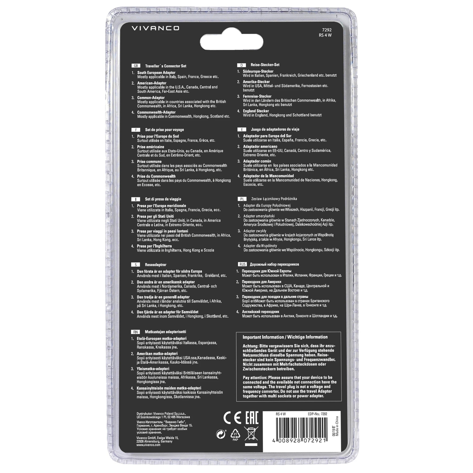 VIVANCO - Set de prises de voyage - Prise UE | Prise US vers prise US | Prise UK | Prise Commonwealth