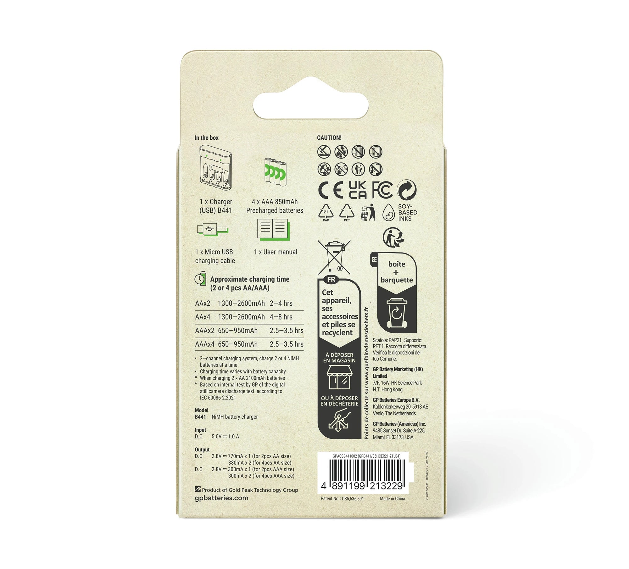 GP NiMH - Recyko - Charger USB AAA | HR03 - Multipack - 4 Stuks + Lader + USB Kabel - 1.5 V - 850 mAh - Oplaadbaar Batterij