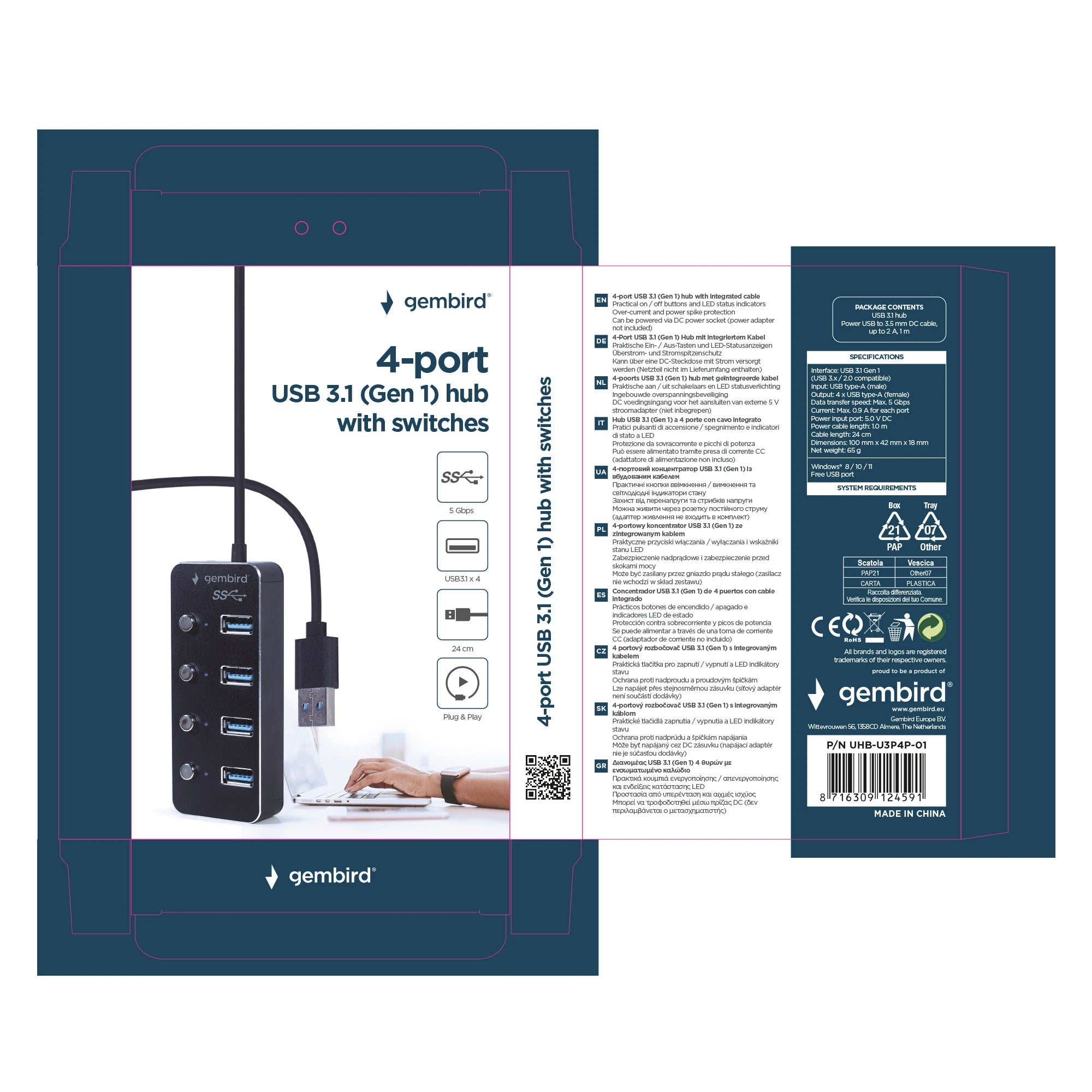 GEMBIRD - Docking station - USB-A (Male) - 4 x USB-A (Female) 0.15 m USB 3.1| switchable