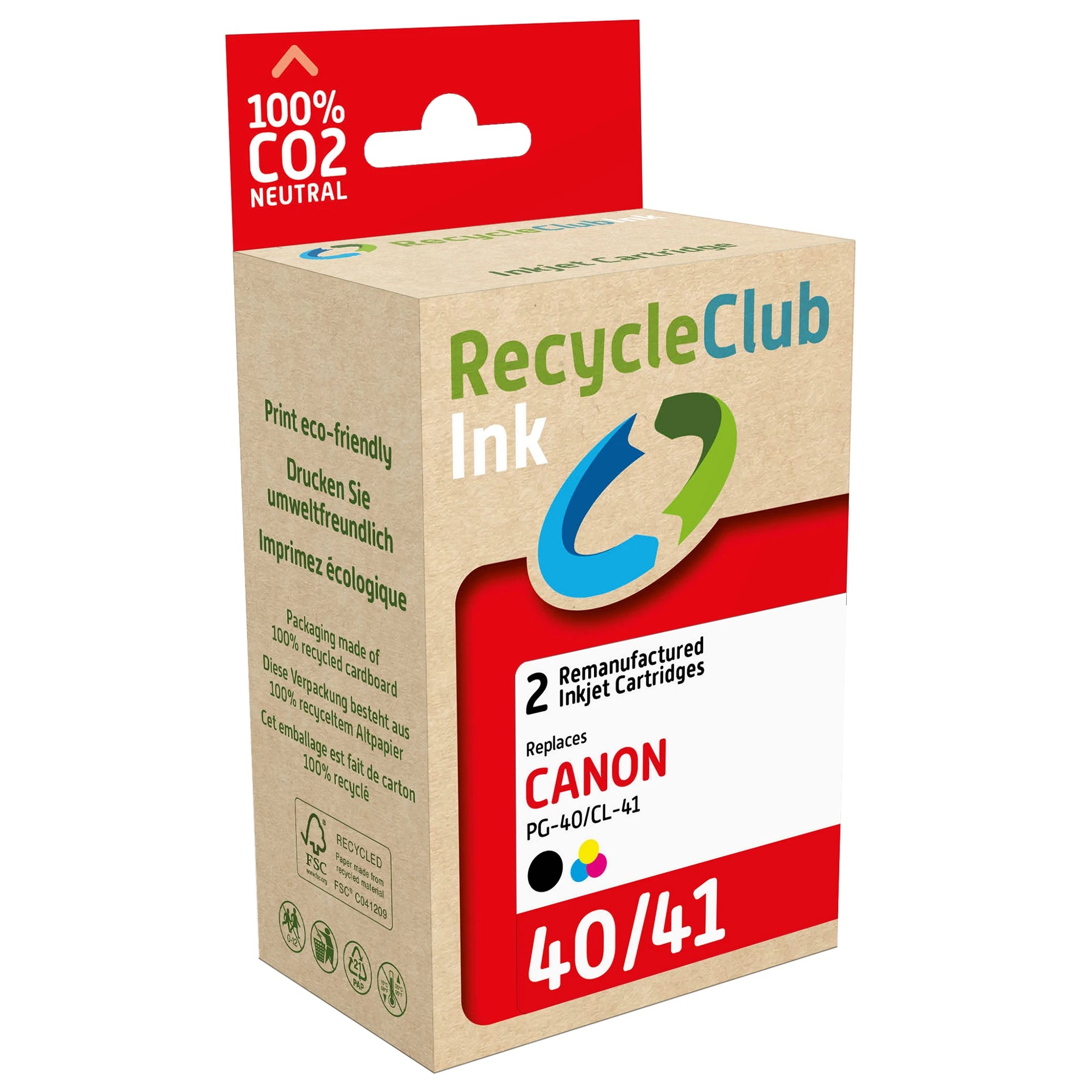 This RECYCLECLUB Cartridge is part of a Duo Pack containing PG40 | CL41 Black + Multicolor and is a perfect and, above all, more economical alternative to a Canon Cartridge. A RECYCLECLUB Cartridge can be used in several Canon printer models. A RECYCLECLUB Cartridge is produced by infusing a recycled cartridge with the best ink in the market. You can print 680 Pages Black & 665 Pages (Cyan, Magenta, Yellow) because of the content of 22 ml (Black) & 21 ml (Mulitcolor), this is a better page yield than with the original Canon Cartridge.